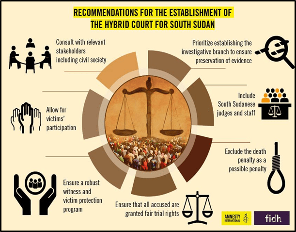 These ‘blended’ constructions that lie somewhere between domestic and international courts possess significant advantages. They are close to the events which makes it easier to retain evidence and allows for victims and witnesses to appear in person. It also bestows legitimacy to the processes and brings expertise and cool-heads in the form of foreign, unbiased judges to the table. Such deliberations occurred in 2015, when two years after the civil war broke out, an African Union (AU) inquiry report signalled international crimes such as war crimes and possibly crimes against humanity were committed and stressed the need of international cooperation to achieve justice.